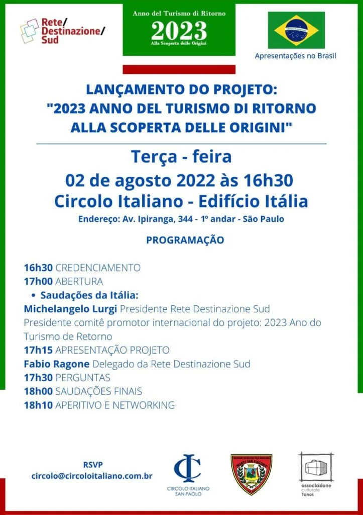 O evento “2023 Anno del Turismo di Ritorno. Alla Scoperta delle Origini” (“2023 Ano do Turismo de Retorno. Descobrindo as origens”, em tradução livre), na capital paulista, contará com a presença de Michelangelo Lurgi, presidente do comitê promotor internacional e idealizador do projeto.