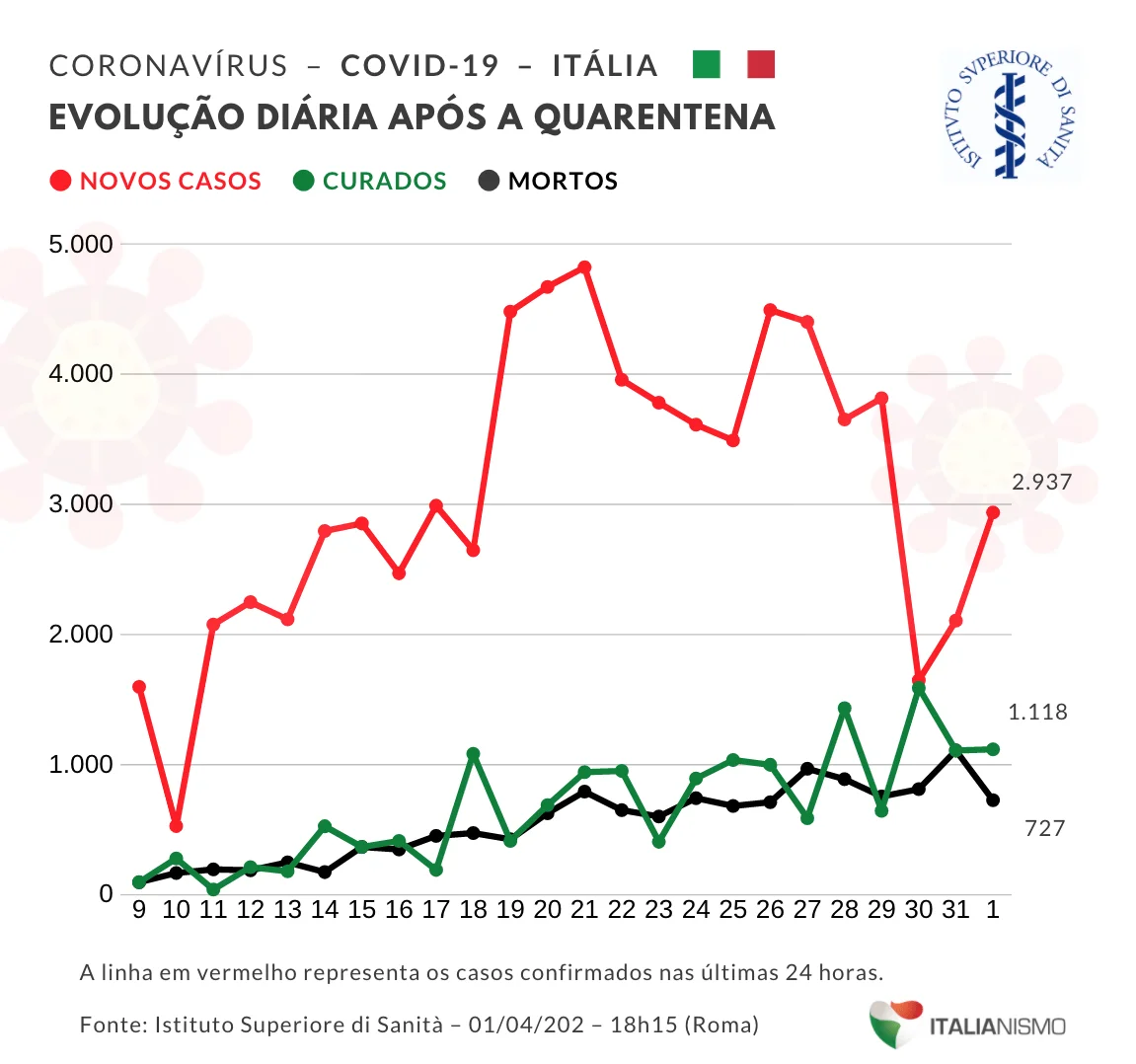 O ministro da Saúde da Itália, Roberto Speranza, confirmou nesta quarta-feira, 1º, que as medidas de confinamento, previstas para terminar em 3 de abril, serão prorrogadas até o dia 13, que cai na segunda-feira após a Páscoa, feriado no país.
