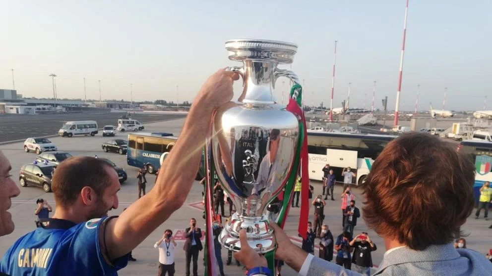Quando Mancini e Chiellini apareceram no topo dos degraus do avião em Fiumicino, os operadores em solo entoaram cânticos e aplaudiram os campeões.