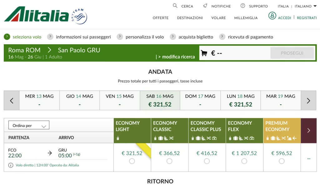 No site da companhia já é possível encontrar voos a partir do dia 16 de maio, que partirão de Roma aos sábados, segundas e quarta-feiras, sempre às 22 horas (horário de Roma), chegando em Guarulhos às 05h da manhã (horário de Brasília).