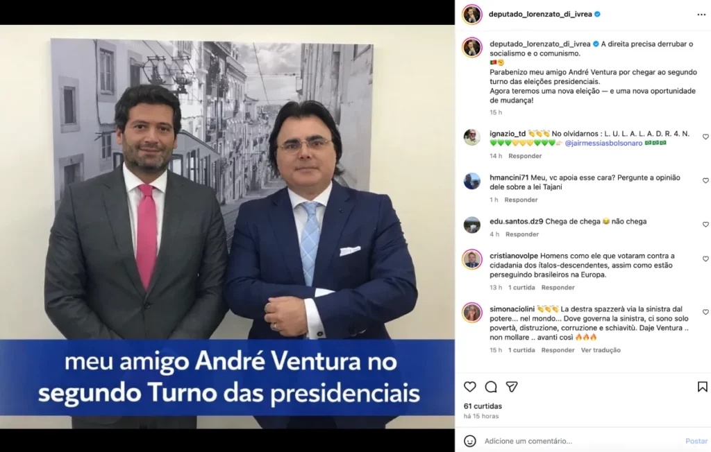 “A direita precisa derrubar o socialismo e o comunismo”, escreveu Lorenzato. Ele parabenizou Ventura por chegar ao segundo turno e afirmou que o pleito representa uma “nova oportunidade de mudança”.