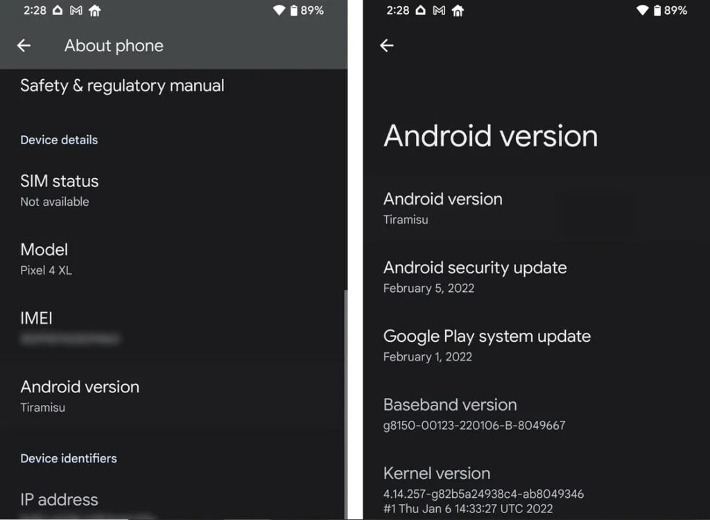 A descoberta foi feita no menu de configurações do novo sistema operacional. Na parte de “Sobre o telefone” é possível ler o nome Tiramisu na parte de “Versão do Android”. Confira, abaixo, o registro divulgado pelo site 9to5Google.
