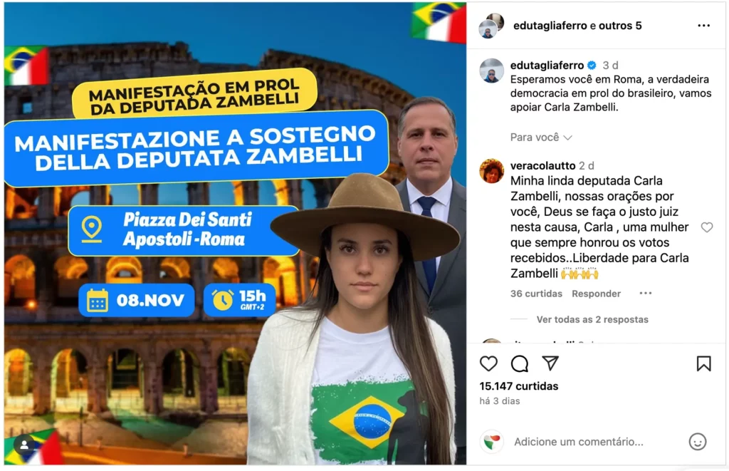 A manifestação do dia 8 tem o apoio de Eduardo Tagliaferro, que divulgou o evento nas redes sociais. “Esperamos você em Roma, a verdadeira democracia em prol do brasileiro, vamos apoiar Carla Zambelli”, declarou.