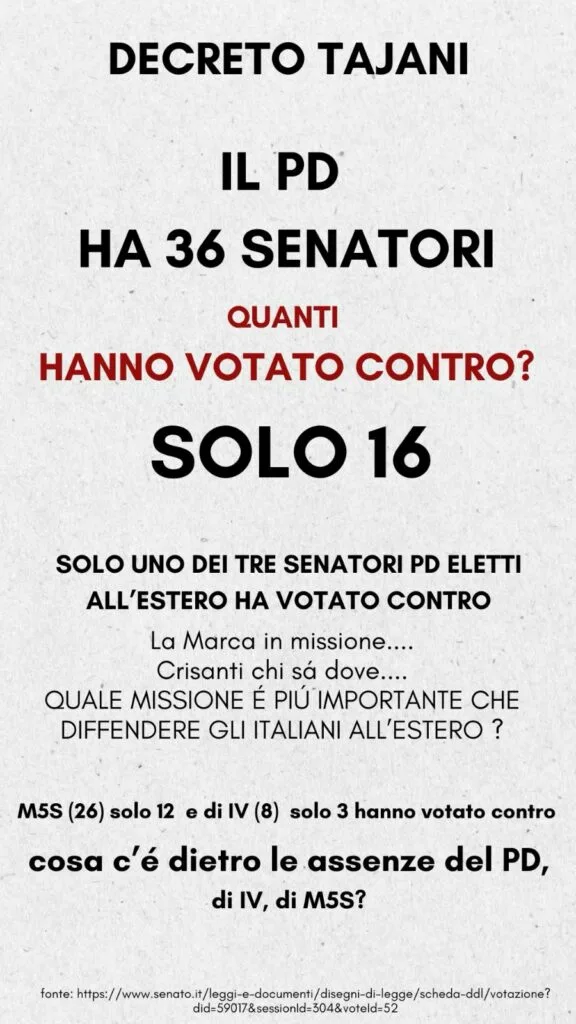 O questionamento de Merlo não se limitou ao Partido Democrático. Em uma publicação que circula entre representantes da comunidade italiana no exterior, é destacado que dos 36 senadores do PD, apenas 16 votaram contra o decreto. A crítica também se estende a outros partidos de oposição.