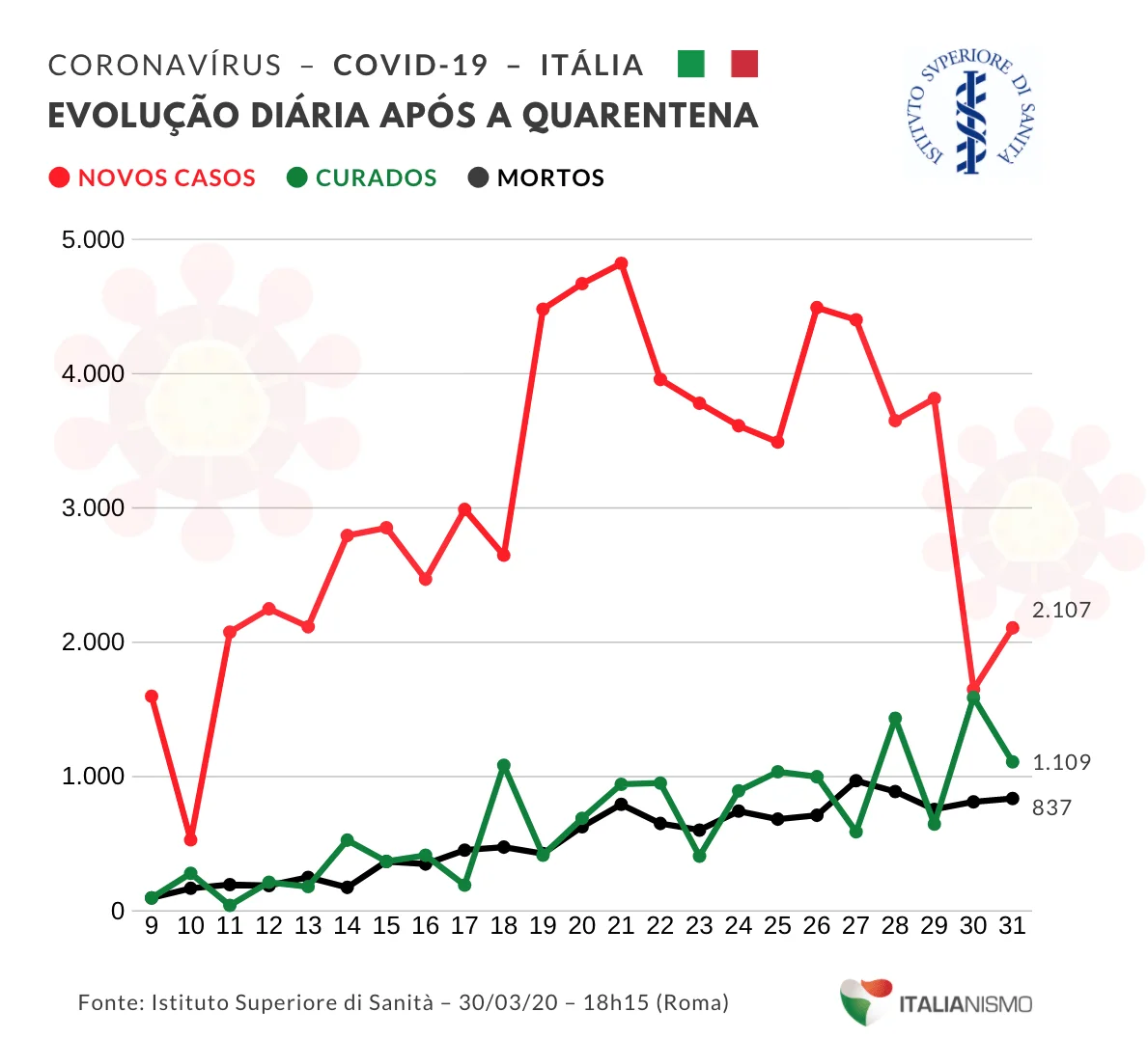 O número de casos confirmados de covid-19, a doença causada pelo coronavírus, na Itália subiu para 105.792 nesta terça-feira (31), sendo o segundo país com o maior número de infecções registradas, atrás dos Estados Unidos, que somam 161.807 casos.