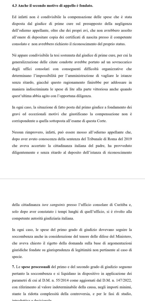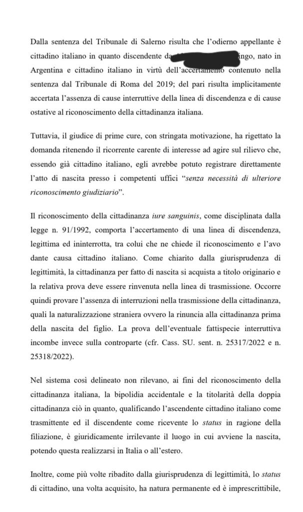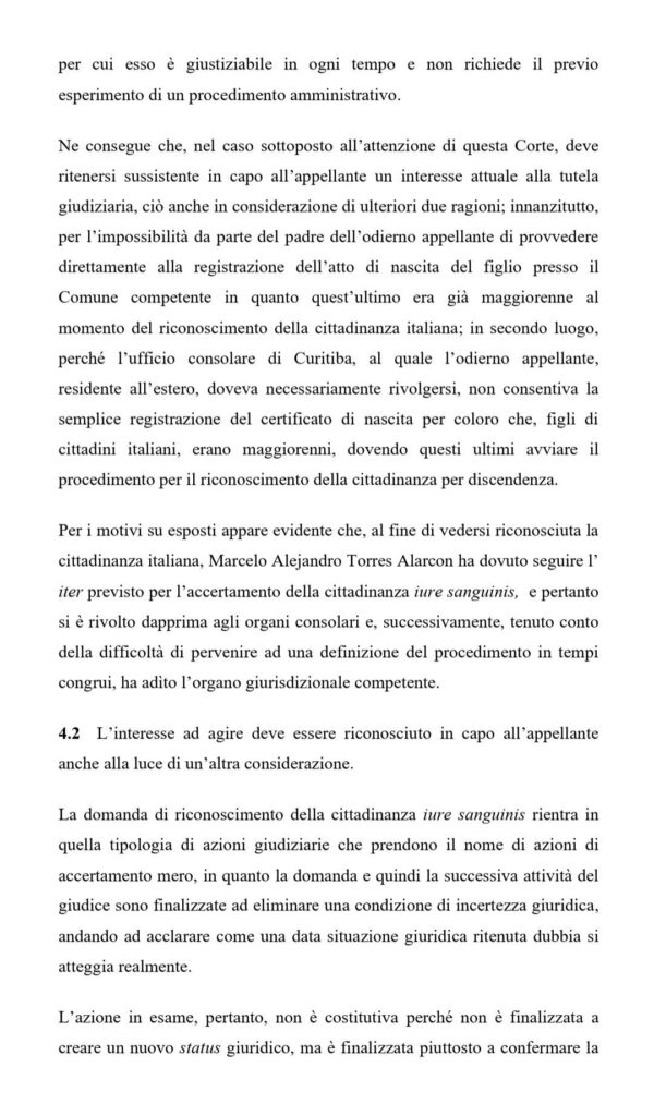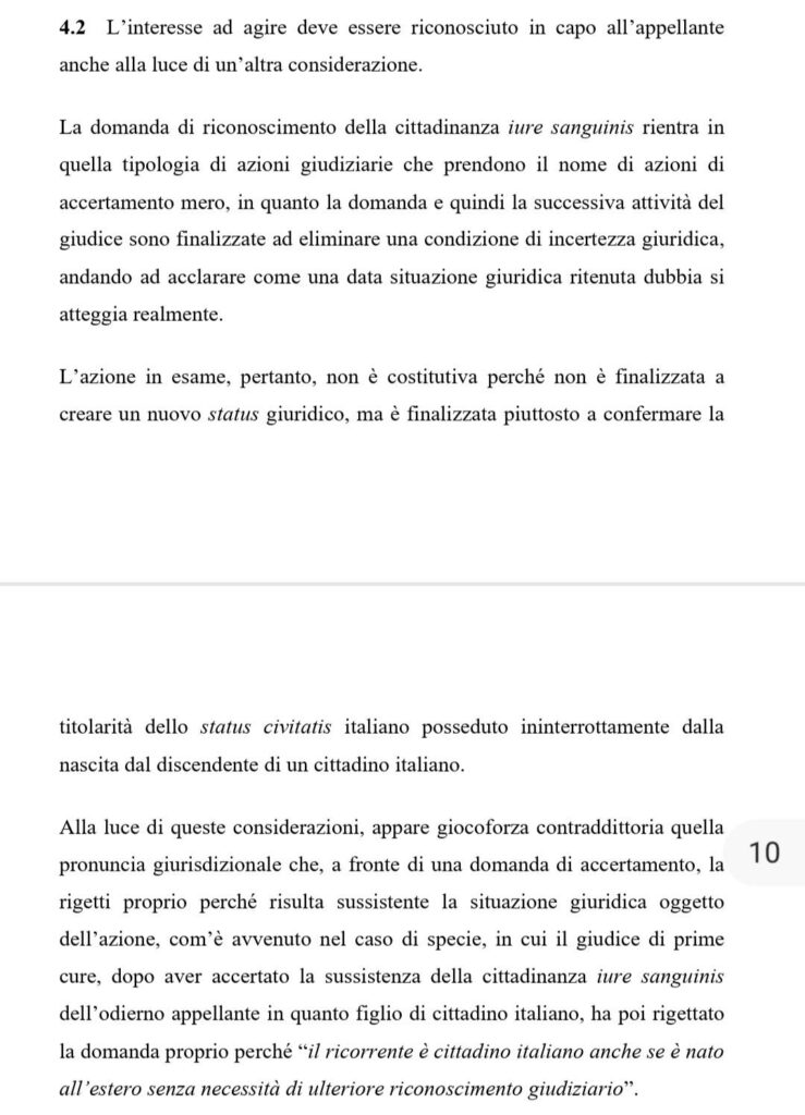 Contudo, a Corte de Apelação de Salerno acolheu a reconstrução jurídica apresentada pela advogada Maria Stella La Malfa. O acórdão esclarece que a cidadania é um título originário e que o pedido judicial serve para eliminar incertezas.