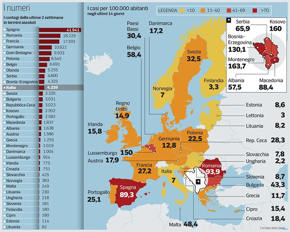 Um infográfico produzido e publicado pelo jornal Corriere della Sera mostra que os casos de Covid-19 registrados na União Europeia estão aumentando de maneira preocupante.