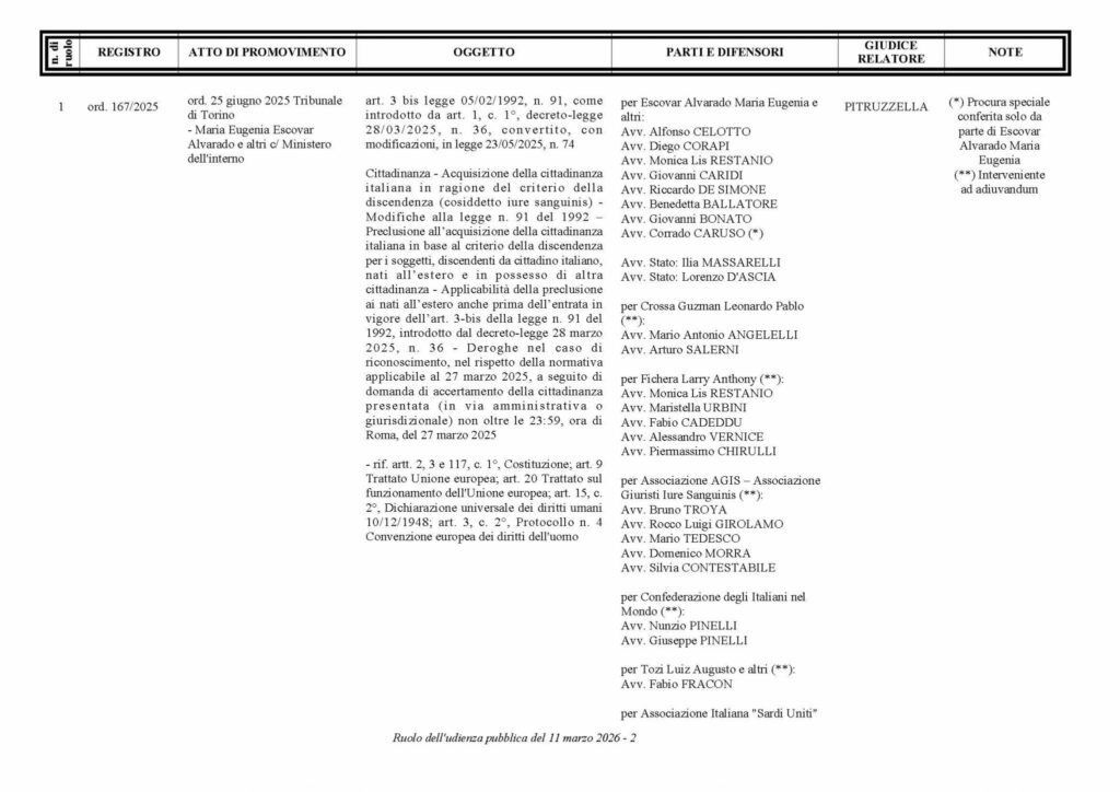The case concerns provisions of Decree-Law No. 36/2025 related to Italian citizenship by descent. The action originates from a decision by the Turin Court, which questions the constitutionality of the Tajani Decree.