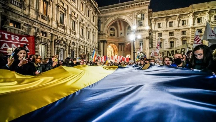 Em Milão e Nápoles, uma multidão se reuniu para abrir uma “bandeira da paz” em solidariedade à Ucrânia.