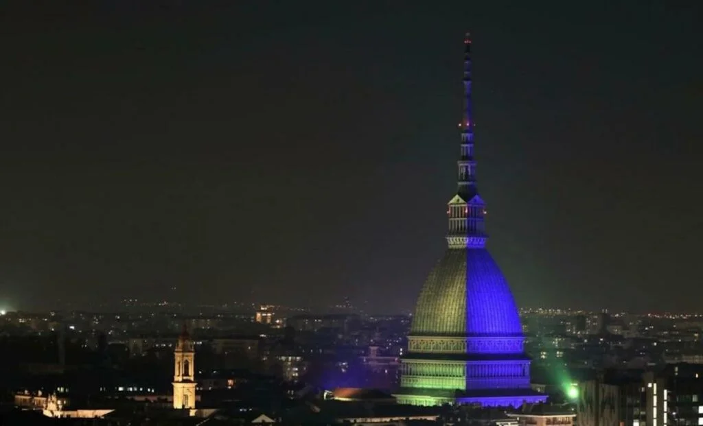 Além do Coliseu, a Mole Antonelliana também foi tingida de amarelo e azul, em um gesto para expressar a solidariedade da cidade de Turim para Kiev, assim como a estátua de David, em Florença.