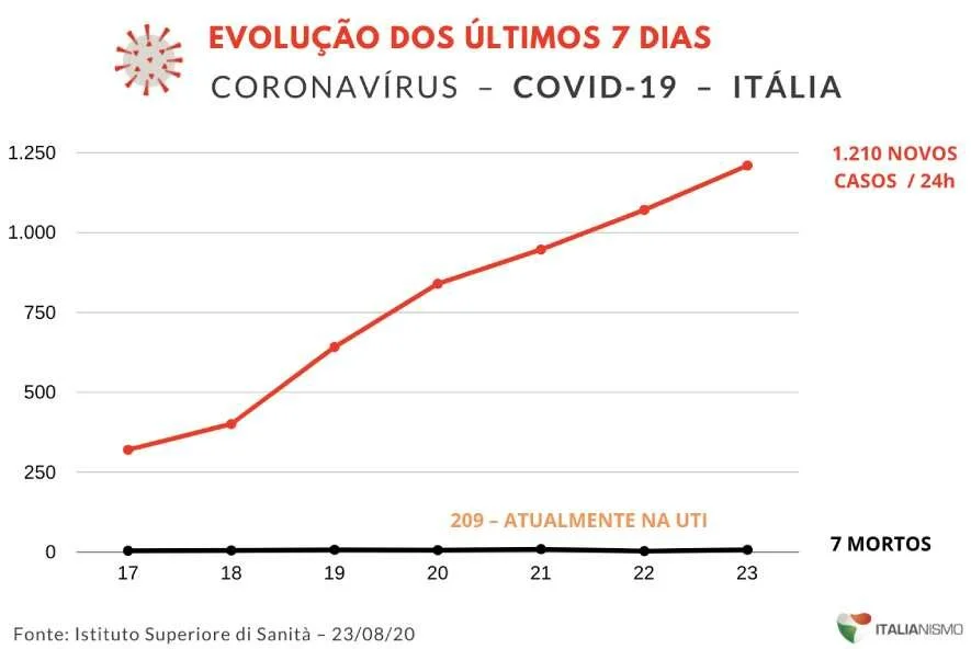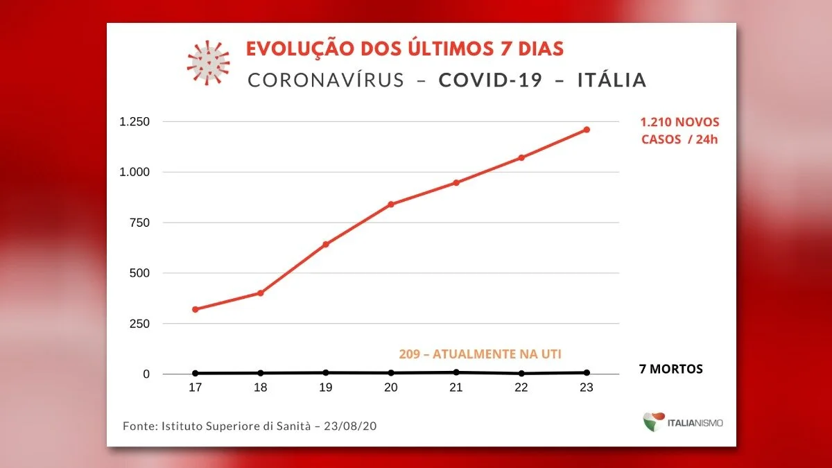 Este é o segundo dia seguido que o país ultrapassa a marca de mil contágios diários. Ontem (22), 1.071 infecções foram somadas ao balanço. Ao todo, existem 259.345 diagnósticos positivos para a Covid-19 em todo o território italiano.