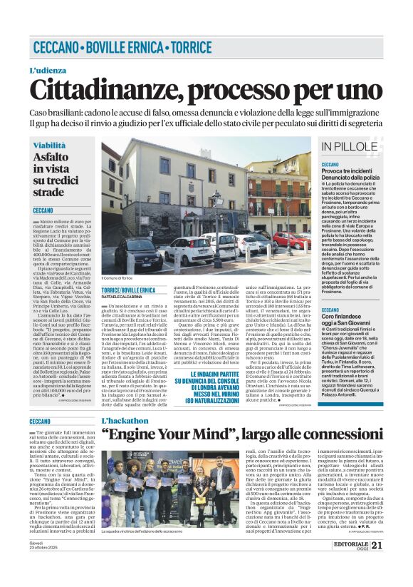 O Tribunal de Frosinone arquivou as acusações de fraude documental, omissão e violação das normas de imigração ligadas ao reconhecimento da cidadania italiana a descendentes de trentinos. Segundo o jornal Ciociaria Oggi (veja a página completa no final deste artigo), apenas um dos réus será julgado — por peculato, e não pelas práticas de cidadania.