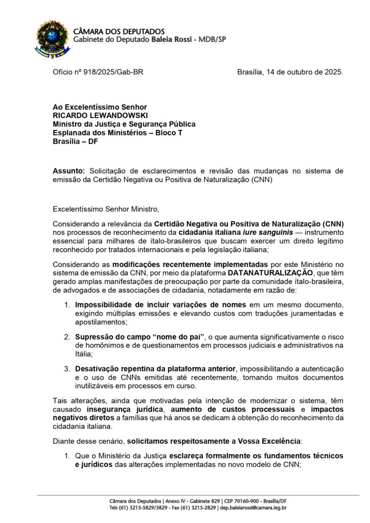 A solicitação formal foi encaminhada ao Ministério da Justiça no dia 14 de outubro de 2025, por meio de ofício assinado pelo deputado federal Baleia Rossi (MDB-SP), a pedido do amigo Lorenzato.