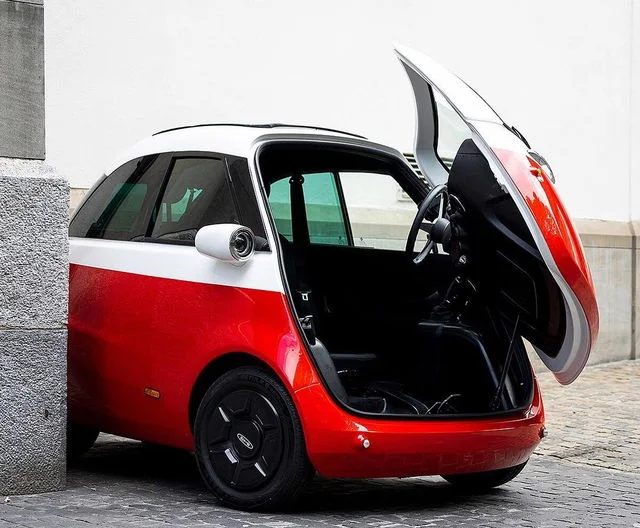 Com apenas espaço para dois e uma porta malas com 300 litros, o Microlino pesa cerca de 450 kg, monta motores com dois níveis de potência e duas capacidades de bateria, em que a mais generosa prevê 200 km entre recargas.