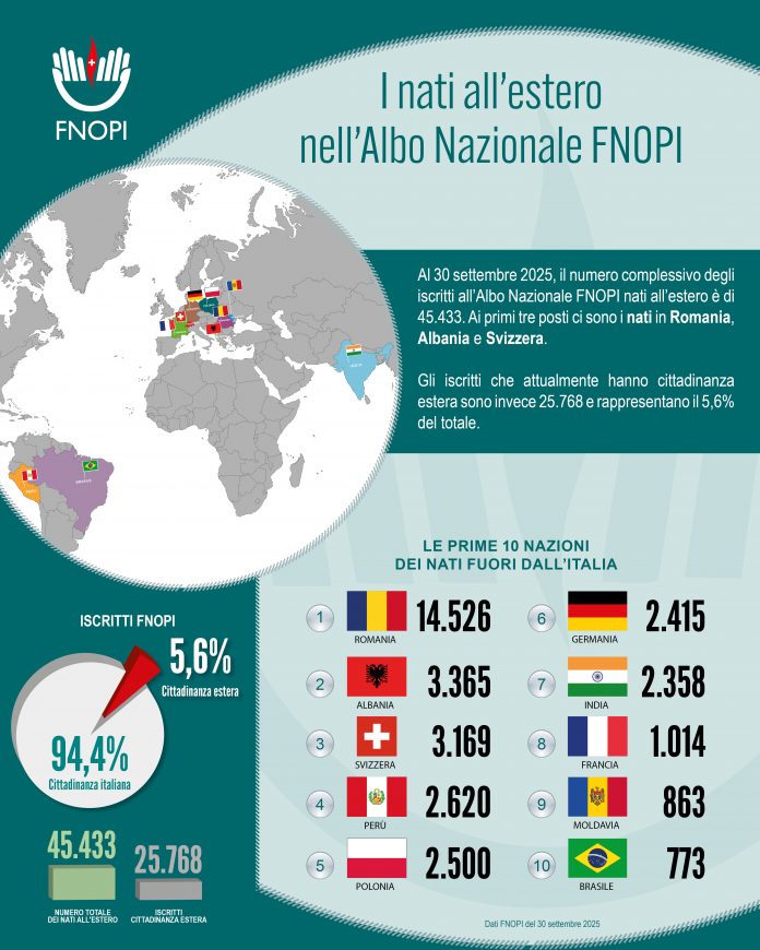 O número de enfermeiros estrangeiros inscritos na Federação Nacional das Ordens das Profissões de Enfermagem da Itália aumentou de forma consistente em 2025. O novo relatório DataCorner, publicado pela FNOPI, mostra que 45.433 profissionais nascidos fora da Itália fazem parte do registro nacional