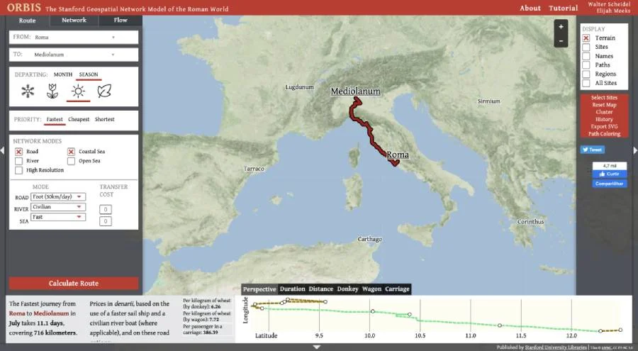 Usando a plataforma Orbis para simular uma viagem de Roma a Milão, podemos descobrir o tempo e os custos exigidos há 1800 anos.