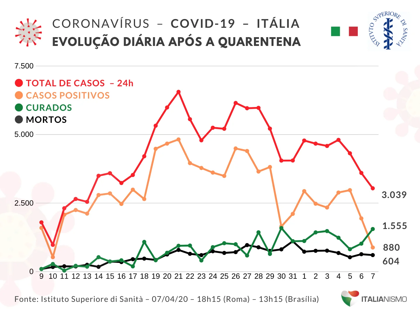 “Hoje, uma redução na tendência de crescimento dos novos infectados é confirmada. Hoje, 880 novos infectados, é o menor aumento desde 10 de março”, disse Angelo Borrelli, chefe do departamento de Proteção Civil durante a divulgação boletim de Proteção Civil.