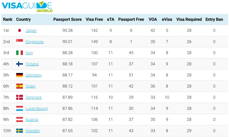 De acordo com o novo índice VisaGuide.World Passport Index, que é o primeiro a classificar os passaportes mundiais de maneira mais abrangente e precisa, com base em uma fórmula cuidadosamente construída que leva mais fatores em consideração, a Itália obteve 88,28 pontos no índice, de 100, enquanto os dois primeiros, Cingapura e Japão, pontuaram 90,28 e 90,01, respectivamente.