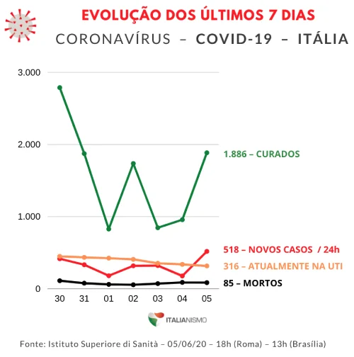 Pelo sexto dia seguido, menos de 100 pessoas morreram devido ao Covid-19 na Itália.