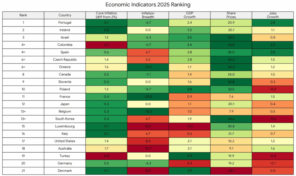 Segundo o ranking, Portugal lidera com um crescimento do PIB de 2,4% no terceiro trimestre, inflação em baixa e uma alta de 20,9% no mercado acionário. A revista destacou ainda o avanço do turismo e a chegada de estrangeiros com alto poder aquisitivo, atraídos pelas condições fiscais.