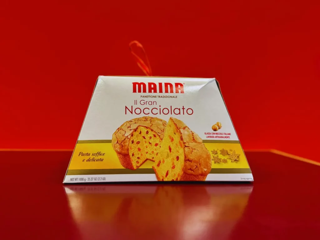 Produzido com 60 horas de fermentação, o panetone da Maina apresenta uma cobertura crocante de avelã. É descrito como um galup paffuto (formato baixo e gorducho), com aroma equilibrado do início ao fim da degustação.