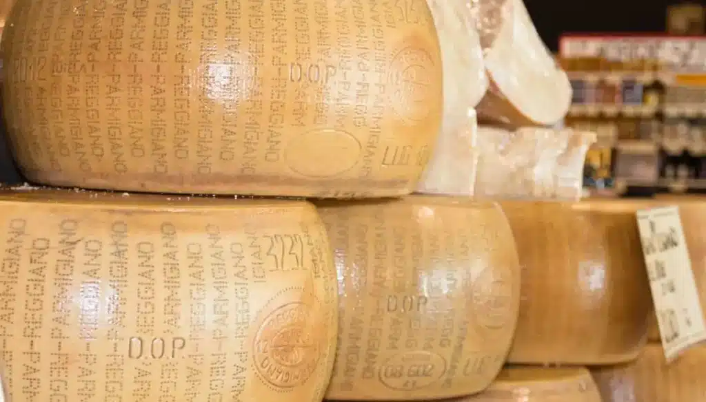 Logo atrás está o Parmigiano Reggiano DOP, com crescimento de 7,2%. Símbolo da gastronomia italiana, o queijo produzido na Emilia-Romagna e parte da Lombardia segue como um dos mais valorizados da Europa.