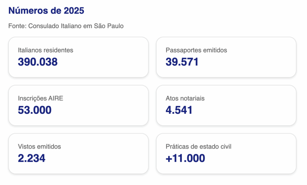 O consulado fechou 2025 com 390.038 italianos residentes. “É como se fôssemos o município de Bolonha e eu o prefeito, brincando, claro”, disse. Segundo Fornara, o número aumentou em 10.000 pessoas em relação ao ano anterior, apesar de as inscrições terem sido muito superiores.