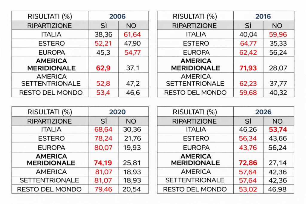 Dez anos depois, a Reforma Meloni-Nordio foi rejeitada por quase 54% dos eleitores residentes na Itália, enquanto foi aprovada por 72,86% dos residentes na América do Sul. Os residentes na Europa seguiram a tendência nacional e rejeitaram a reforma com 56,24% de votos pelo NO, percentual ligeiramente superior ao dos residentes na Itália, confirmando a tendência ideológica de centro-esquerda.