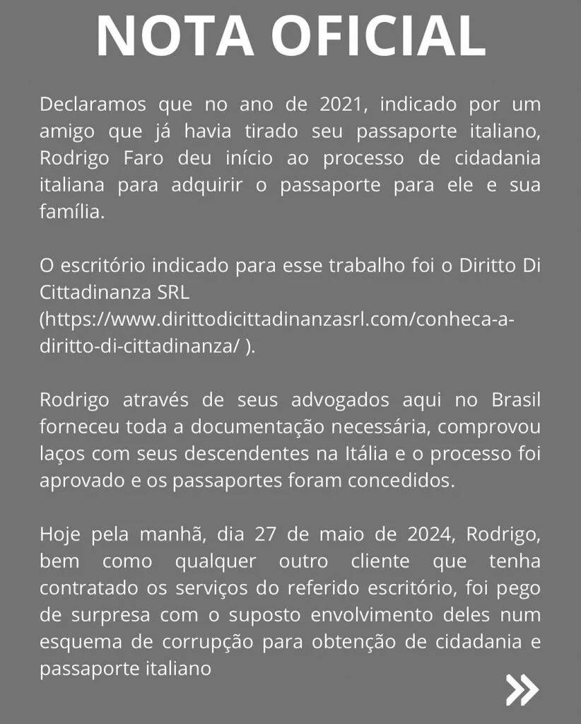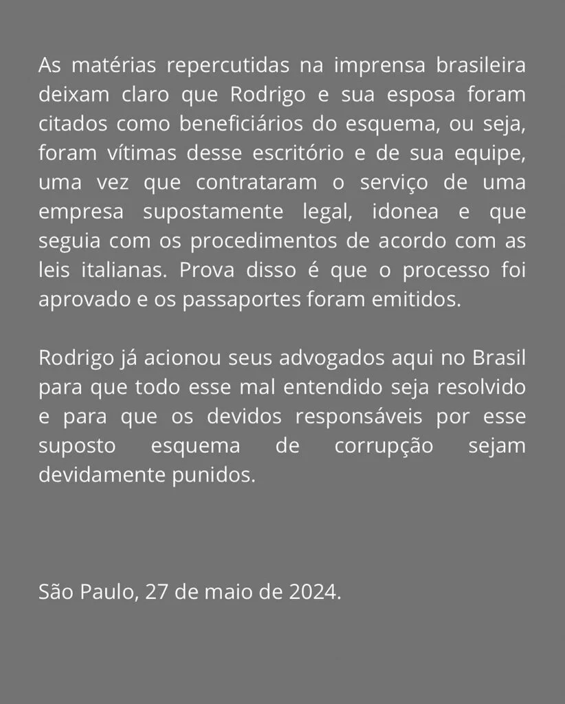A nota prossegue mencionando: “Hoje pela manhã, dia 27 de maio, Rodrigo, bem como qualquer outro cliente que tenha contratado os serviços do referido escritório, foi pego de surpresa com o suposto envolvimento deles em um esquema de corrupção para obtenção da cidadania de passaporte italiano”.