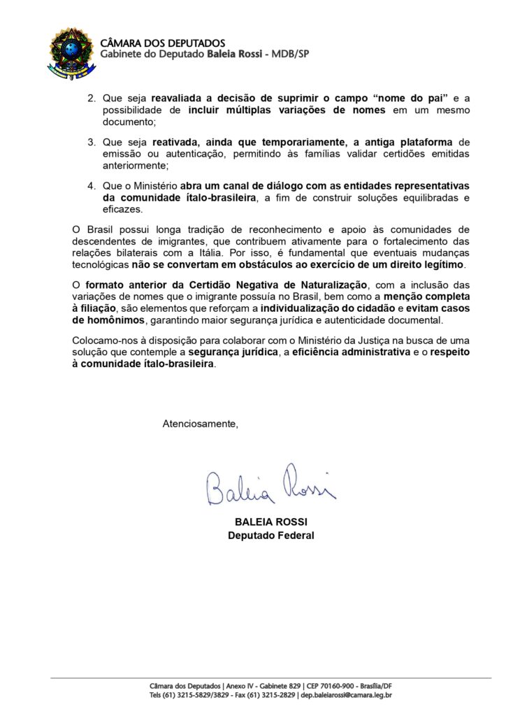 應其朋友洛倫扎托 (Lorenzato) 的要求,聯邦議員巴萊亞·羅西 (Baleia Rossi) (MDB-SP) 於 2025 年 10 月 14 日透過正式信函向司法部發送了正式請求。